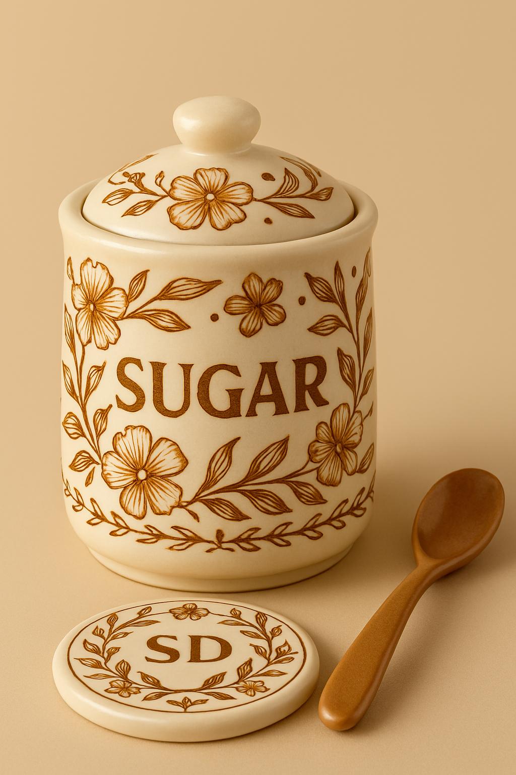 • Matching sugar jar with lid and floral details